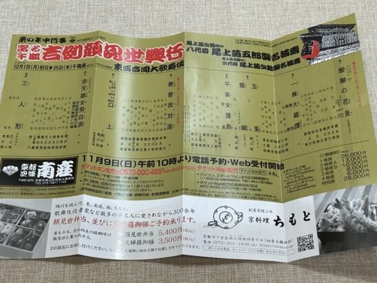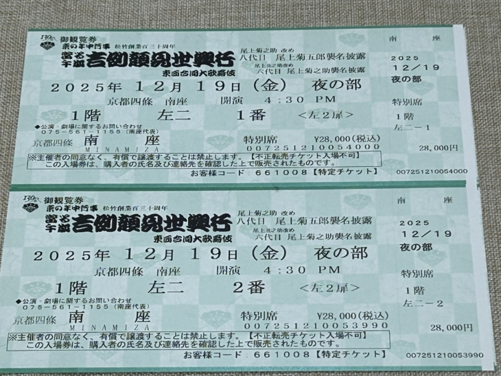 今年の京都・南座の吉例顔見世の良い席のチケットが、届きました。