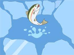 氷の割れ目から魚が跳ね上がる
