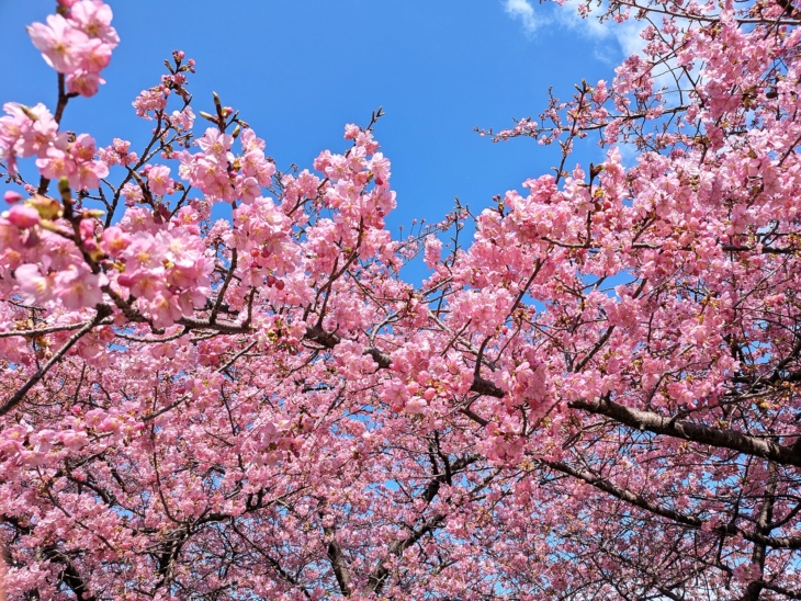 芽吹き、岡崎市の河津桜も7~8分