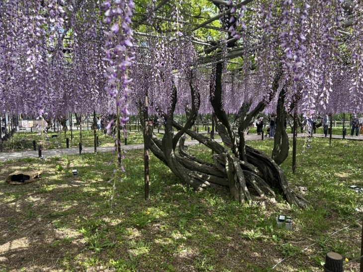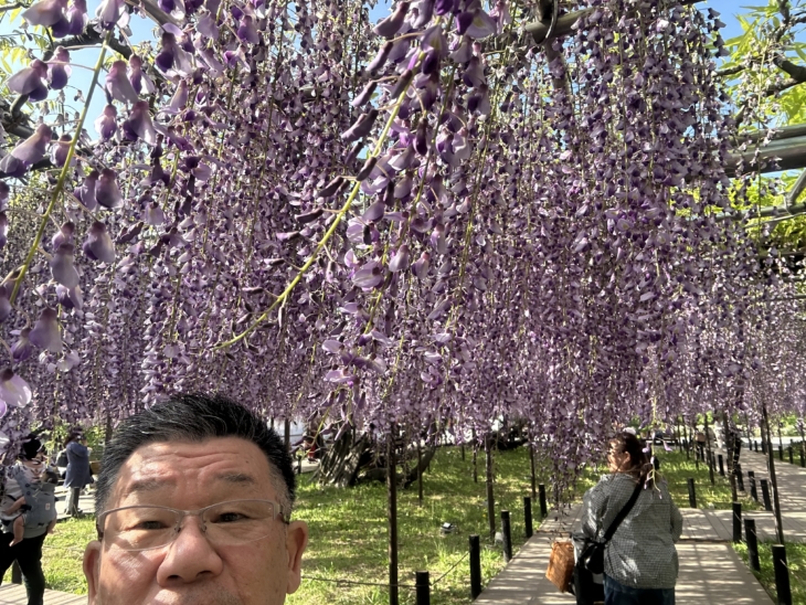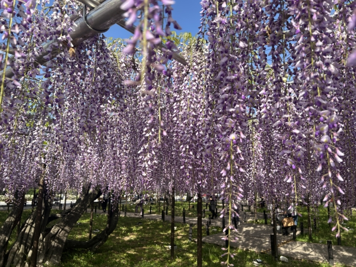 人出で賑わっていて満開の「藤」を