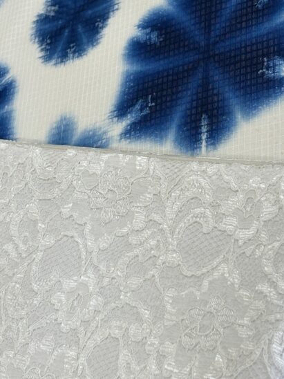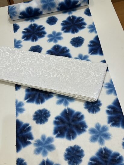 白地に青色の濃淡色上がり「雪花絞り」ゆかた地のご紹介です。