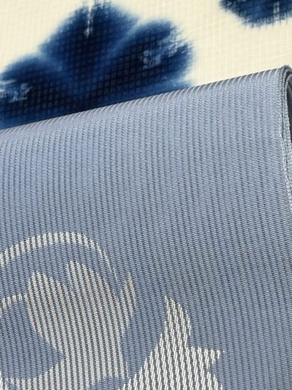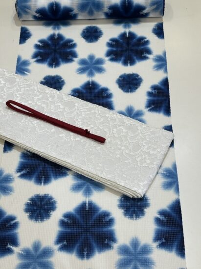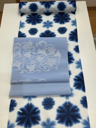 白地に青色の濃淡色上がり「雪花絞り」ゆかた地のご紹介です。 | 着物・貸衣装・レンタルなら岡崎の「いちこし」へ。